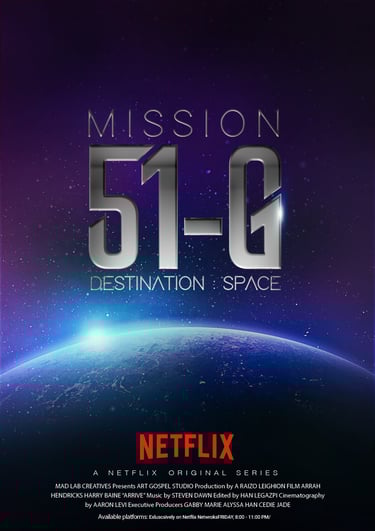 As a Senior Art Director, my responsibility was to design the documentary poster for STS-51-G. This mission marked the 18th flight of NASA's Space Shuttle program, launching from Florida and landing in California in June 1985. It was the first Space Shuttle mission without a pre-Shuttle astronaut and included the first Arab, Muslim, and royal family member in space, Sultan bin Salman Al Saud. I aim to capture the mission's essence in a visually compelling poster that accurately reflects the documentary's focus and tone. Through research and design, I'll create an informative and inspiring poster showcasing the bravery and pioneering spirit of those involved in STS-51-G. The poster will highlight Prince Sultan's historic journey, serving as a timeless tribute to this significant chapter in Saudi Arabia's space exploration history.